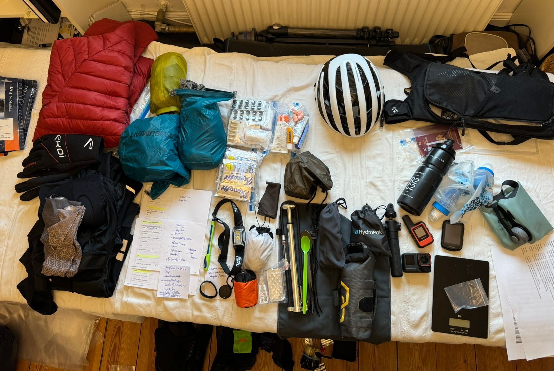 Die Wahl der Ausrüstung für ein Ultracycling-Adventure ist ein bisschen wie die Vorbereitung auf eine Himalaya-Expedition (nur viel bescheidener): Du willst leicht und schnell sein aber dennoch nichts entbehren, was dich im Zweifel aus heiklen Situationen rettet. Das ist ein Widerspruch in sich. Ausrüstung ist viel Erfahrungssache, viel Geschmackssache - und immer ein Kompromiss. Einige Gegenstände würde ich immer wieder mitnehmen, andere nicht mehr. Oft fliegt kurz vor dem Start noch was raus.