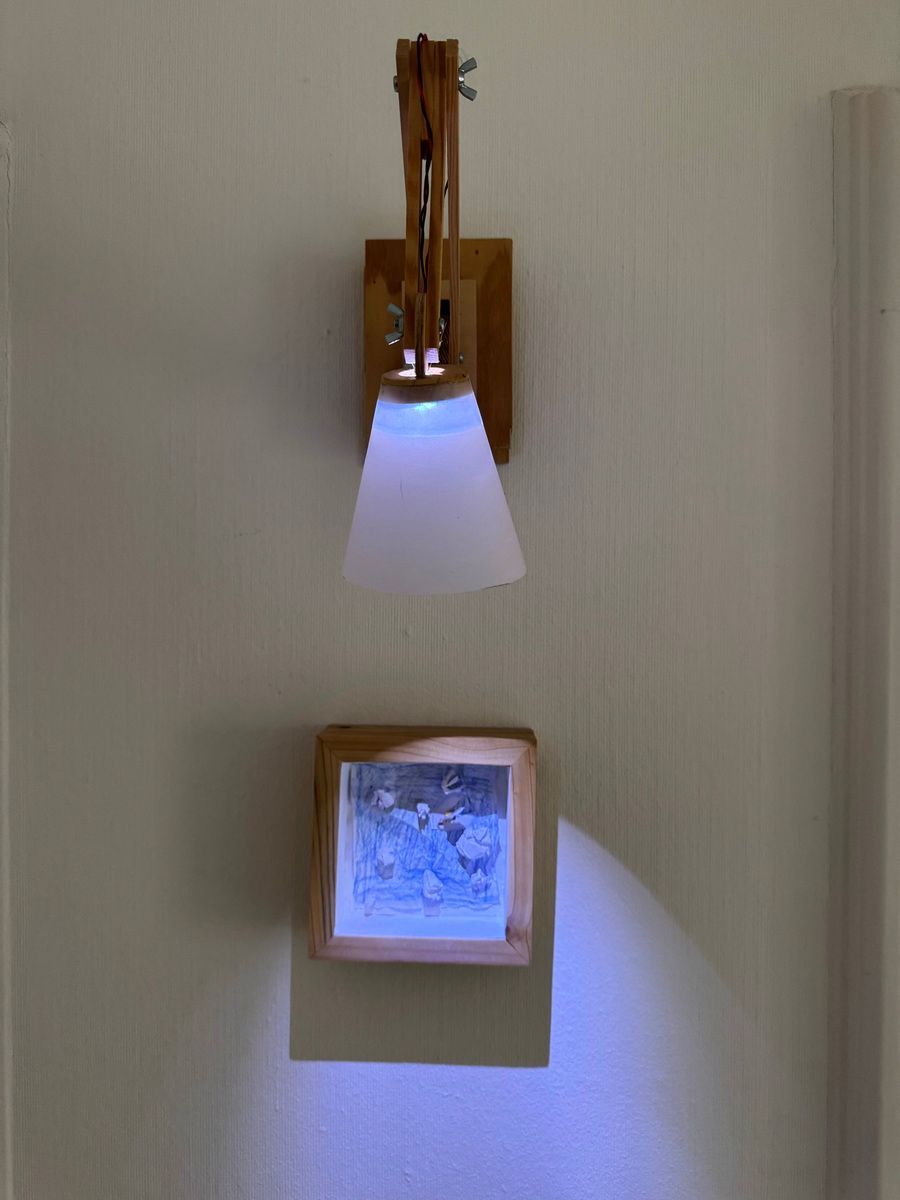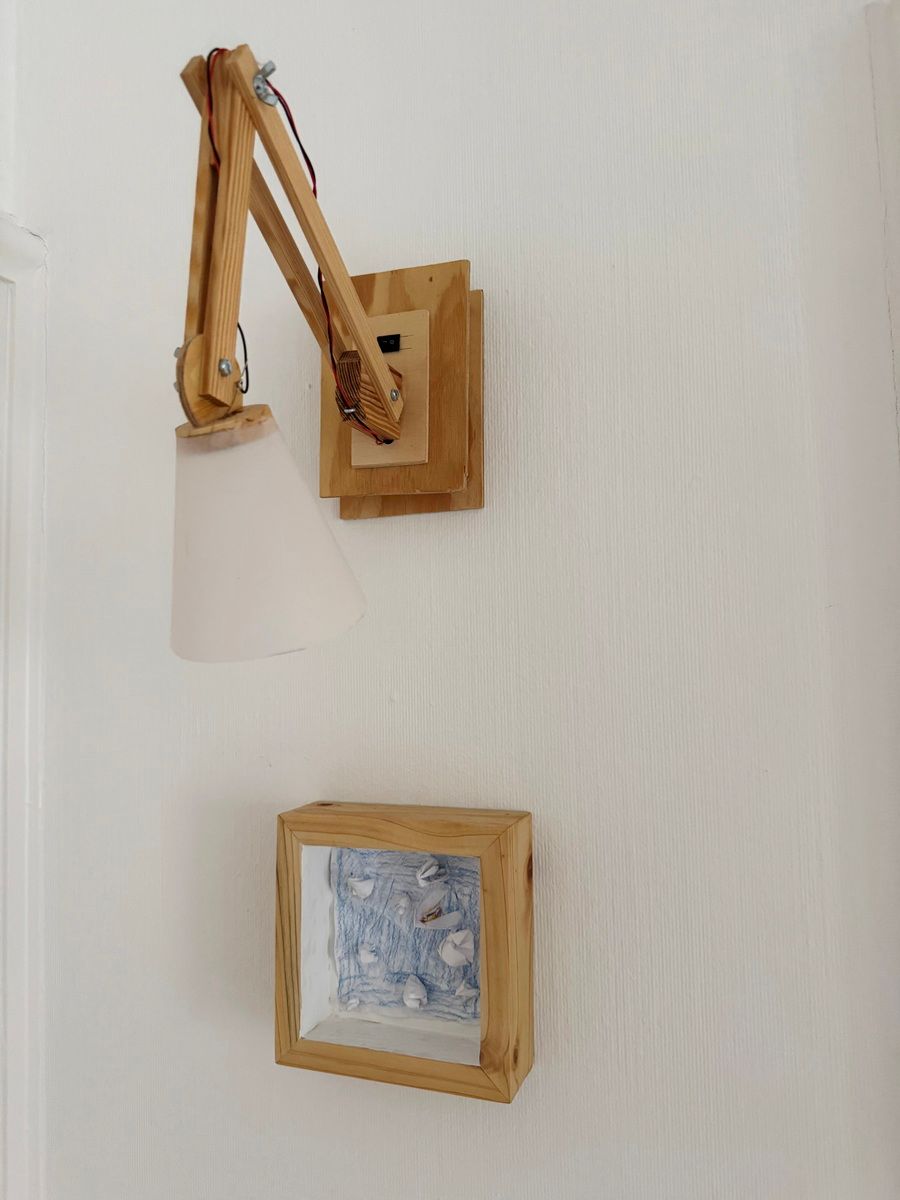 Ich habe alles zusammen im Eingang an der Wand montiert, und nun haben wir eine Installation an der sich freuen kann, wer einen Blick dafür hat. Den Lampenarm musste ich ein bisschen höher hängen, damit nicht dran hängen bleibt, wer dem Ganzen nicht ausreichend Beachtung geschenkt hat. Also fast alle, die vorbei gehen.
