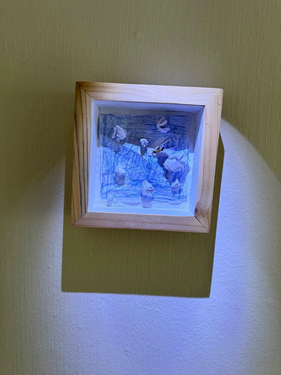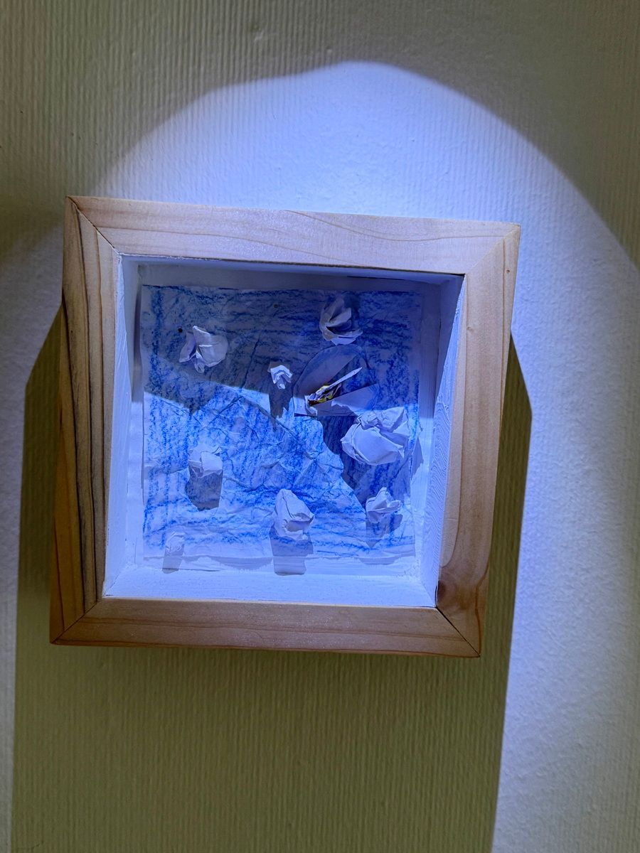 Den Papierbogen zum Beispiel, den er so hingebungsvoll blau angemalt und zerknüllt hatte wie das nur Vierjährige können, um dann ein winziges Segelboot mit allerliebster Bugwelle in die aufgewühlte See zu setzen. Eine Titanic von Segelschiff, zwischen den bedrohlichen Eisbergen aber immer noch unbeschädigt und unterwegs in zügiger Fahrt.