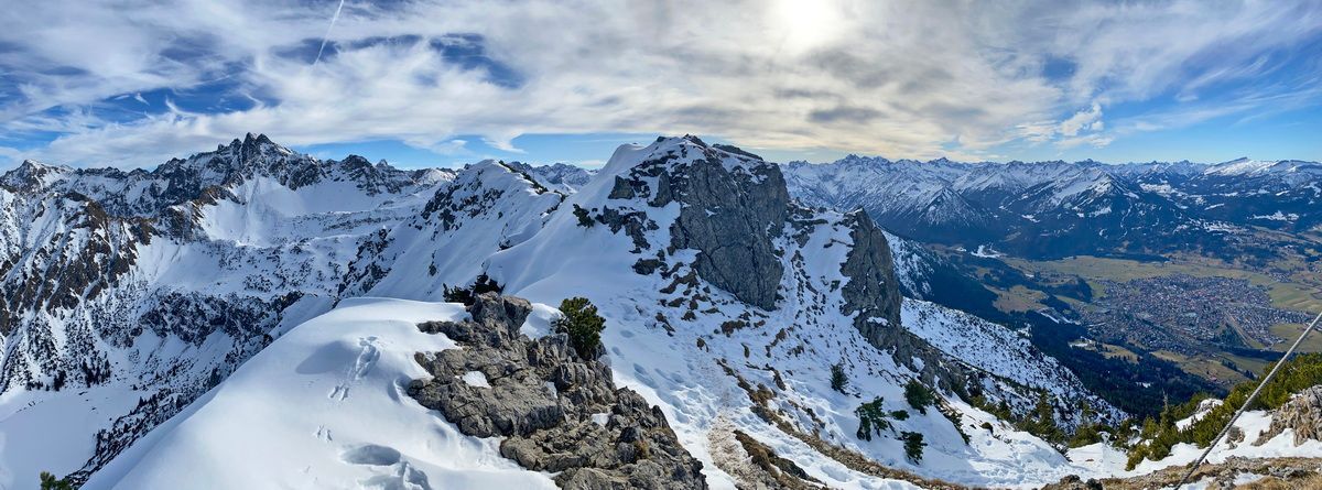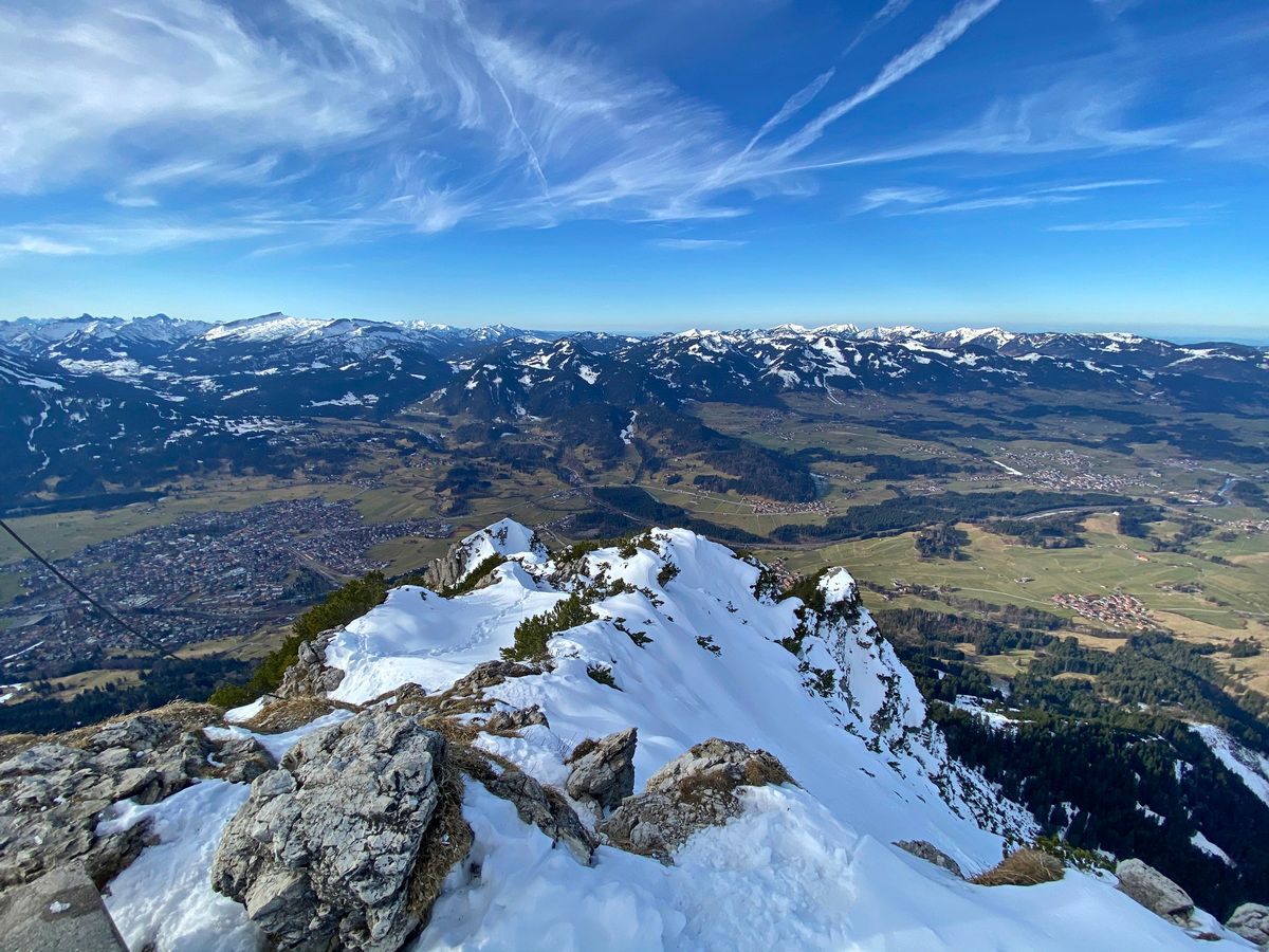 Um 12 Uhr stehen wir nach dem Wandausstieg (von wo man auch wieder abseilen kann) und anstrengendem Gewühle durch das recht steile Gipfelschneefeld am Gipfelkreuz. Die Sonne strahlt, und es öffnet sich ein grandioses Panorama: Rechts unter uns liegt Oberstdorf, ringsum die Allgäuer Alpen, wundervollstes Licht, hinten am Horizont mindestens zehn Heißluftballone - die Matrix meint es heute auf geradezu kitschige Weise gut mit uns. "Carpe Diem" wird eben belohnt. Brotzeit, erst mal. Und Fotos. Durch die Wand selbst haben wir knappe drei Stunden gebraucht für die acht Seillängen, in schönstem Plaisir-Tempo. Weitere drei Stunden später sind wir zurück am Parkplatz. Hollereiduliöh! (what something means like „Hell Yeah!“).